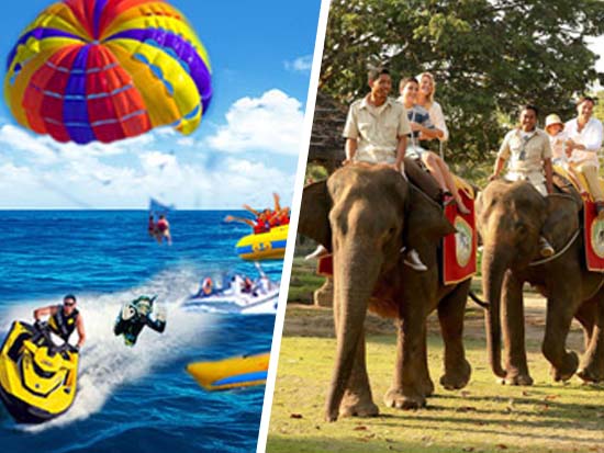 Water Sports and Elephant Ride Tour is an Bali Double Activities Tour Packages to try two famous activities in one day, first you will enjoy the water sports activity and then continue to riding an elephant in Bali islands. Is great combo adventure we created in to single tour packages by allowed you and your family to try our selection Water Sports activity such as : Banana Boat, Flying Fish, Glass Bottom Boat and Turtle Islands Tour in the best beach. You will assist by our professional Water Sports instructor. The Water sports and elephant ride tour more enjoyable with our Golden Bali Tour Driver by perform an excellent tour services with Private Car. After finish the adventure of water sports, we will directly go to elephant park, before ride the elephant you will enjoy the lunch buffet Indonesian food first, After lunch we will continue your adventure by give you opportunity to riding the biggest animal through the jungle and passed the local village to see the social activities life in this village in the top of the elephants with duration 30 minutes ride.